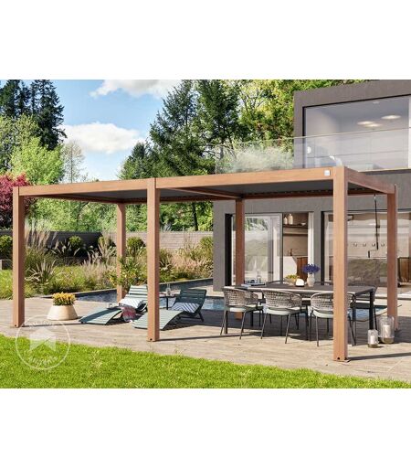 3x6m Pergola, louvered roof, oak finish: Minimalist, rust-resistant, and built for year-round use—the deluxe pergola is the perfect blend of style and functionality. Featuring a practical aluminium roof with adjustable slats, it allows you to control sunlight and ventilation with ease. The smooth crank mechanism enables effortless adjustment, opening the slats up to approximately 135 degrees. Thanks to their hollow chamber profile, these slats offer exceptional stability and a high snow load capacity. Available in three sizes—3x3m, 3x4m, and 3x6m—the pergola comes in a choice of stylish finishes: a wood-effect frame with a pearl grey slatted roof, a pearl grey frame with a matching roof, or a sleek white frame with a white roof. Whether freestanding or positioned against a building, this pergola combines elegance with durability. Additional benefits include an integrated water drainage system, full resistance to corrosion and weathering, and a high degree of pre-assembly for quick and easy installation. ...