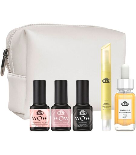 The WOW Hybrid Gel Polish Starter Set contains everything you need for a perfect gel look - without a light device! The innovative 2-step polish system (color + top) combines the advantages of a soak-off and nail polish system. WOW evens out nail ridges and offers an even and ultra-shiny surface thanks to the plumping texture. For ultra-long wear - up to 10 days. 100% vegan and removable with acetone-free nail polish remover. Contents: In the "midnight garden" trend bagWOW Hybrid Gel Polish, 8 ml "princess doll"WOW Hybrid Gel Polish, 8 ml "silk emotion"WOW Hybrid Gel Top Coat, super fast, 8 mlPolish CorrectorPineapple Refreshing Nail Shot, 11 ml Advantages: Perfect high gloss gel nails ~ The "plumping" gel texture evens out ridges and ensures an even finish.Easy application in 2 steps ~ Apply color, use top coat - done!Without UV lamp ~ Time-saving gel manicure without UV rays.Quick-drying ~ The innovative WOW system dries in daylight.Long-lasting ~ Up to 10 days of intense shine, can be refreshed in between with WOW Top Coat.Protective and gentle on the nail ~ Optimizes the nail structure.Easy to remove ~ Can be removed with any nail polish remover, without acetone! Vegan ~ without animal ingredients and cruelty-free Note: Due to the photoinitiators it contains, the WOW Hybrid Gel Polish System must be protected from direct sunlight. Application: The perfect WOW result in just two steps - you don't need a base coat as this is included in the color polish. A primer can be applied to degrease the nail. Step 1: Apply two thin coats of LCN WOW Hybrid Gel Polish.Step 2: After drying, apply a thin coat of LCN WOW Hybrid Top Coat Super Fast. Important: Always wrap the edge of the nail.You can gently clean the nail fold with the Nail Polish Corrector. Finally, apply the Nail Shot included in the set to the nails. The pineapple extract contained in the nail shot makes the nails shine. Rich in vitamins C and E, it protects the nail and rebuilds the nail plate. ...