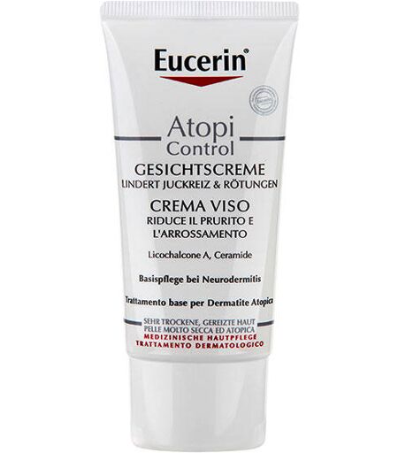 Eucerin AtopiControl Face Cream is suitable for soothing and strengthening atopic skin. The light care formula with 12% omega-6 fatty acids and Licochalcone A. is ideal for treating dry and chapped skin in symptom-free phases of atopic dermatitis. In addition, the natural ingredients relieve itching and redness of the facial skin and strengthen the skin barrier. The cream is quickly absorbed and forms an excellent base for make-up. Dermatological studies confirm the very good skin compatibility for atopic dermatitis and atopic skin. Eucerin AtopiControl Face Cream is fragrance-free and without dyes and parabens. It is suitable for adults, children, babies and for contact lens wearers. In acute phases of atopic dermatitis, Eucerin AtopiControl Acute Care Cream should be used. Effective help from nature Evening primrose seed oil This high-quality vegetable oil has a high content of the omega-6 fatty acids linoleic acid and gamma-linolenic acid. As an ingredient in Eucerin AtopiControl Face Cream, they strengthen the skin's protective function and reduce moisture loss. Rough and dry skin becomes smoother and more supple. Grape seed oil Grape seed oil is rich in vitamin E and essential fatty acids. The polyphenols and flavonoids it contains have a strong anti-oxidant effect and protect against free radical damage. Vitamin E provides moisture and supports the regeneration of highly stressed skin. Licochalcone A Licochalcone A is extracted from the root of the Chinese licorice plant (Glycyrrhiza inflata). It is a powerful antioxidant that soothes the skin and neutralizes free radicals that damage skin cells and accelerate skin aging. Deeper epidermal layers of the skin are protected from harmful UV rays. ...