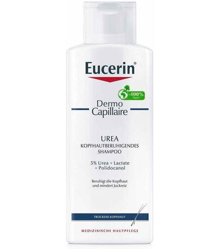 Eucerin DermoCapillaire Urea Scalp Soothing Shampoo for dry and itchy scalp. Eucerin DermoCapillaire Urea Scalp Soothing Shampoo gently cleanses the hair and has a soothing effect on dry and itchy scalp. The gentle shampoo is suitable for use in cases of neurodermatitis. It gives hair a healthy, radiant shine and protects the scalp from irritation. For optimal results, it contains the active ingredients urea and lactate. They stabilize the skin barrier and reduce moisture loss. Polidocanol reduces itching and noticeably improves the condition of the scalp. The mild formula without fragrances is suitable for children from three years and for very sensitive skin prone to neurodermatitis or psoriasis. Urea and lactic acid as moisturizers Urea is a natural skin component that binds moisture in the upper layers of the skin. Due to the natural aging process, environmental influences and skin diseases such as neurodermatitis, the urea in the skin decreases and it becomes dry and cracked. Eucerin DermoCapillaire Urea Scalp Soothing Shampoo is enriched with artificially produced, highly effective urea and makes the skin supple. Lactate (lactic acid) dissolves cornification in the skin, regulates pH and also moisturizes. Numbing the itch Eucerin DermoCapillaire Urea Scalp Soothing Shampoo contains the active ingredient polidocanol. This is a superficial numbing agent that reduces the sensitivity of nerve fibers and endings. As a result, pain and itching are no longer felt so strongly and the body can relax. During pregnancy, large-area application of polidocanol should be avoided. ...