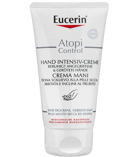 Eucerin AtopiControl Hand Intensive Cream for daily care of affected hands reduces dryness and redness as well as skin irritations. It makes the skin more resistant and resilient, supports regeneration and can be used to prevent hand eczema and neurodermatitis. With regular use, the skin condition improves in the long term. The oil-in-water cream is quickly absorbed into the skin and is not greasy, so it can be used at any time as needed. For intensive and basic care Eucerin AtopiControl Hand Intensive Cream is suitable for daily basic care for atopic dermatitis in relapse-free periods. In acute phases, it can be used as intensive care. A combination with topical and oral medicines is possible. If the skin is dry, irritated, cracked or reddened due to frequent washing or contact with cleansing agents, the high-quality ingredients support rapid regeneration. The skin care efficacy for moderate, acute atopic hand eczema as well as excellent skin tolerance was confirmed in a study. Effective care complex Eucerin AtopiControl Hand Intensive Cream contains plant-based active ingredients such as Licochalcone A and ceramides, which soothe the skin and support regeneration of the skin barrier. As a result, the skin becomes more resistant and no longer reacts as strongly to environmental influences. Licochalcone A also has anti-inflammatory and antimicrobial properties that help skin redness, itching and cracking to subside. Ceramides make the skin soft and supple and have anti-aging properties. They act as a protective layer against moisture loss. Menthoxypropanediol is a menthol derivative. It has a pleasant cooling effect and relieves itching. Oatmeal strengthens the natural skin barrier, soothes skin irritations and promotes the healing of injuries. ...