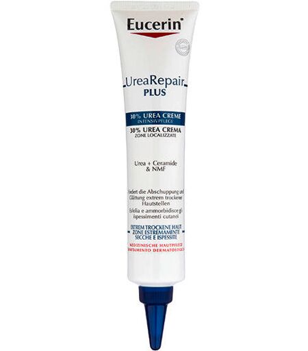 Skin areas such as elbows, hands, knees and feet are constantly exposed to strong mechanical stress. If the protective skin barrier is disturbed in these areas, the skin can quickly dry out, become rough, flake and, in the long term, thicken. Eucerin UreaRepair PLUS 30 % Urea Cream gives extremely dry skin the intensive care it needs. It contains a unique combination of ingredients: Highly-concentrated 30 % Urea exfoliatedCeramides, which repair the skin barrierother natural moisturizing factors to bind moisture in the skinThis intensive care should be applied only on affected skin areas, especially not on wounded skin or the whole body. Clinically and dermatologically confirmed that the skin is visibly smoother and more supple after one week of use and always improves with regular use. Suitable for hyperkeratotic skin conditions and psoriatic plaques. Directions: Apply once or twice daily to affected areas of dry, rough, keratinized and scaly skin on the elbows, feet, hands and knees. Do not apply to open, bloody or weeping wounds. Avoid eye contact, especially if the product is applied to the hands, otherwise clean hands thoroughly after application. Skin is exposed to factors such as weather, aggressive cleansing care and natural aging. This can lead to moisture loss and thus symptoms of dry skin: The skin feels uncomfortably rough, taut, itchy or tends to flake. The products in the UreaRepair care series are enriched with urea and other natural moisturizing factors (NMF) - for an intensive supply of moisture. Eucerin UreaRepair PLUS immediately soothes the signs of dry skin thanks to its unique Repair PLUS Complex and provides 48 h long-lasting protection. Eucerin UreaRepair ORIGINAL offers you the proven and rich urea care. All products are dermatologically tested and also ideal for the care of dry skin in old age as well as accompanying therapy for various diseases such as keratosis pilaris or diabetes. ...
