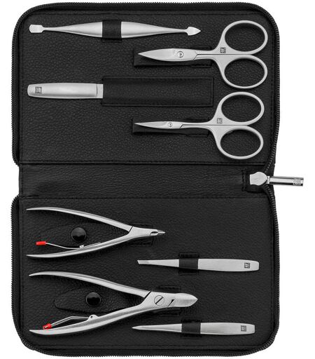 This stylish and professional 8-piece premium case contains fine manicure instruments that are easy to care for and particularly durable thanks to the high-quality materials. Nail scissors, cuticle scissors, a cuticle pusher and cleaner, a sapphire nail file, slanted tweezers, pointed tweezers, nail nippers and cuticle nippers are stored safely and neatly in the velvet-covered interior of the robust, black cowhide case with zipper. The finely brushed surface of the stainless steel tools gives the manicure set a matt-satin look. At the same time, it makes them highly resistant to moisture and the associated corrosion. The precise instruments ensure clean and skin-friendly nail care, both at home and on the go. ...
