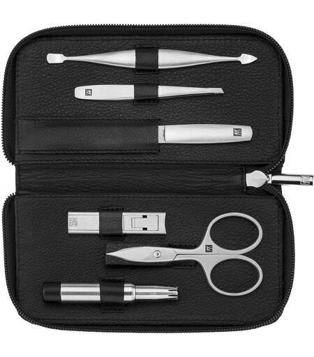 The professional, 6-piece premium care set contains the most important instruments for effortlessly shaping fingernails and toenails and precisely removing nose and ear hair. Nail and cuticle scissors, a compact nail clipper, a sapphire nail file, a cuticle pusher and cleaner, angled tweezers and a nose and ear hair clipper are stored safely and neatly in the velvet-covered interior of the robust, black cowhide leather case with zipper. The absolutely precise manufacture from stainless steel with a matt satin finish and the perfect ergonomic shape of the instruments ensure outstanding durability and functionality in a particularly attractive design. ...