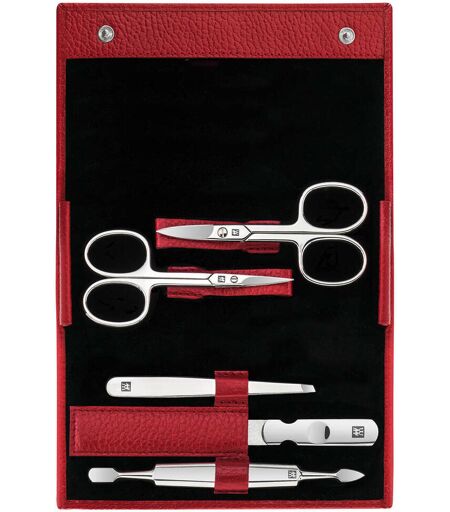 The functional, 5-piece nail care set offers a practical combination of high-quality instruments for the care of fingernails and toenails. Inside the high-quality, red cowhide leather case with press stud fastener, nail scissors, cuticle scissors, a sapphire nail file, a cuticle pusher and cleaner and slanted tweezers are stored safely and neatly. The ZWILLING beauty instruments are made of rust-free, polished stainless steel and offer functionality, durability and corrosion resistance in proven ZWILLING quality. - 5-piece set for comprehensive nail care - Consisting of nail scissors, sapphire nail file, cuticle pusher and cleaner, cuticle scissors and slanted tweezers - Ergonomic and functional design - Made from rust-free, highly polished stainless steel - Red cowhide leather case with press stud fastener and velvet lining on the inside ...