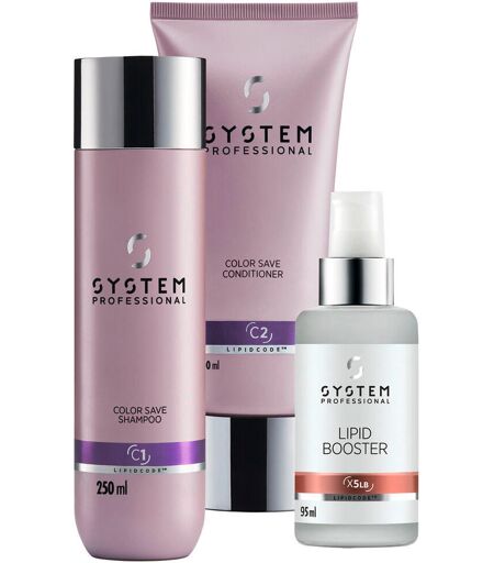 Keep Your Pro-Look! Discover the right products for your home to keep your pro look as long as possible. These three coordinated System Professional LipidCode products give your hair an extra care boost: The Color Save Shampoo and Color Save Conditioner prolong the luminosity of your color and protect your colored hair daily. The LipidBooster, which should be used once a week, provides deep-acting regeneration for severely damaged hair and creates new bonds in the hair. Color Save Shampoo 250 mlColor Save Conditioner 200 mlLipid Booster 95 ml ...