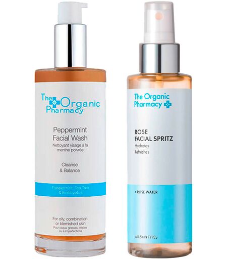 The The Organic Pharmacy Impure Skin Duo contains: 1 x The Organic Pharmacy Peppermint Facial Wash, 100 ml1 x The Organic Pharmacy Rose Facial Spritz, 150 ml Peppermint Facial Wash: A gentle antiseptic and antibacterial wash gel that cleanses the skin without drying it out. Eucalyptus and peppermint cleanse, while lavender and tea tree oil have an antiseptic effect. Leaves skin clean, fresh and revitalised. Rose Facial Spritz: A multi-functional toning spray that refreshes and moisturises the skin. Developed by pharmacists, this refreshing spray mist with organic Damascus Rose is clinically proven to increase the skin's moisture content. It effectively reduces redness and instantly leaves skin feeling fresh with its light rose fragrance. ...