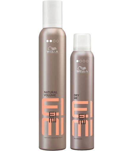 Hair Care Set. 1 x Wella EIMI Volume Dry Me, 180 ml: Dry Shampoo. EIMI Dry Me gives your hair volume and makes it easier to style - even on bad hair days. The professional dry shampoo with tapioca starch absorbs excess grease and gives hair a real freshness boost. For matte styling with volume - and for an airy, fresh feeling! Hold level 1. Application: Shake well before use. Distribute EIMI Dry Me Shampoo evenly through dry hair. Leave on briefly and brush out. 1 x Wella EIMI Volume Natural Volume, 300 ml: Volume foam with heat protection and light hold. With EIMI Natural Volume you give your hair volume with flexible hold and make it feel good and easy to style. The professional mousse protects hair from dryness and heat during blow-drying. For creative styles that turn out great - thanks to the new formula with improved consistency! Hold level 2. Application: Shake well before use. Work EIMI Natural Volume Mousse evenly into damp hair from roots to ends. Then blow dry. ...