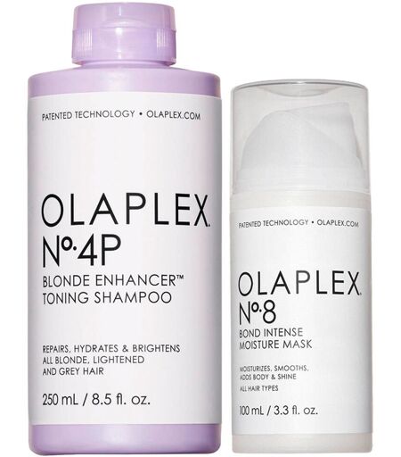 The OLAPLEX No Yellow + Intense Moisture Set includes: 1 x OLAPLEX No. 4P Blonde Enhancer Toning Shampoo, 250 ml1 x OLAPLEX No. 8 Bond Intense Moisture Mask, 100 ml OLAPLEX No. 4P Blonde Enhancer Toning Shampoo: Strengthens, softens and neutralizes unwanted yellow tones for lighter, more manageable hair. The sulfate-free, highly concentrated formula allows for customized toning - the longer you use the treatment, the lighter the result. OLAPLEX No. 8 Bond Intense Moisture Mask: Featuring patented OLAPLEX Bond Building Technology, this highly-concentrated, repairing 4-in-1 mask adds shine, intensely moisturizes and adds fullness. 2x more shine4x more moisture6x more suppleness94% see more fullness OLAPLEX Repairs damaged hair from the inside. Unlike other active ingredients, the original OLAPLEX ingredient does not work from the outside, but repairs hair from the inside out - by permanently bonding broken disulfide bridges in the hair. ...