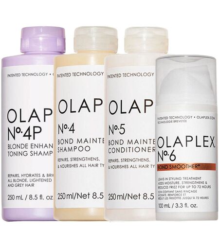 The OLAPLEX Blond Profi Care Set contains: 1 x OLAPLEX No. 4P Blonde Enhancer Toning Shampoo, 250 ml1 x OLAPLEX No. 4 Bond Maintenance Shampoo, 250 ml1 x OLAPLEX No. 5 Bond Maintenance Conditioner, 250 ml1 x OLAPLEX No. 6 Bond Smoother Leave-In Reparative Styling Cream, 100 ml OLAPLEX No. 4P Blonde Enhancer Toning Shampoo: Strengthens, softens and neutralizes unwanted yellow tones for lighter, more manageable hair. The sulfate-free, highly concentrated formula allows for customized toning - the longer you use the treatment, the lighter the result. OLAPLEX No. 4 Bond Maintenance Shampoo: Visibly improves hair structure and gives hair incredible shine. OLAPLEX No. 5 Bond Maintenance Conditioner: Repairs and hydrates hair without weighing it down, improving structural damage and reducing split ends. For strong, healthy and shiny hair. OLAPLEX No. 6 Bond Smoother Leave-In Reparative Styling Cream: Strengthens and protects hair while moisturizing it. Frizz and flyaway hair are eliminated for up to 72 hours. reduces blow-drying timesuitable for all hair typescontains no sulfates, parabens or gluten100% veganpatented technology OLAPLEX Repairs damaged hair from the inside. Unlike other active ingredients, the original OLAPLEX ingredient does not work from the outside, but repairs hair from the inside out - by permanently bonding broken disulfide bridges in the hair. ...