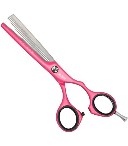 With 39 teeth, these hairdressing scissors make styling easier and thin out the hair. They are reliable styling scissors for men's and women's haircuts. The JAGUAR WHITE LINE promises a diverse selection. The scissor models in the PASTELL PLUS collection are not only colorful, they also have a high-quality metallic coating that offers protection against nickel allergies. Blade and cutting edge All hair scissors and styling scissors have the cutting properties of the proven JAGUAR WHITE LINE. Thanks to the processing of the forged special steel, the blades with a flat cutting angle ensure excellent sharpness. The 39 finely serrated teeth of these modeling scissors ensure a safe and precise cut. The tips of the teeth are specially designed to prevent the hair from slipping away. As a result, these styling scissors are ideal for shaping cut transitions. Steel and surface The forged special steel and additional ice hardening, which allow the special cut of these hairdressing scissors, ensure excellent sharpness and a long cutting edge life. The high-quality metallic coating also protects against nickel allergies. Ergonomics and movement of the scissors NEW in the range: The Crane handle shape ensures ergonomic handling and noticeably relieves the muscles, making work even more comfortable. The little finger can be placed comfortably on the (removable) finger hook, allowing the hairdressing scissors to be guided safely. Together with the blades, the screw system ensures easy and very smooth movement, which makes cutting with the styling scissors pleasantly easy. Pay attention to the perfect setting. Too loose or too tight? - With the VARIO screw connection, you can easily readjust the gear with a coin. Scope of delivery: All JAGUAR WHITE LINE hair scissors are supplied with matching, high-quality finger insert rings. To avoid pressure points, we only use quality insert rings "Made in Germany" for our JAGUAR hairdressing scissors. Crane handle shapeStyling scissors with fine teethProtection for nickel allergy sufferersLarge selection of colorsVARIO screw system ...