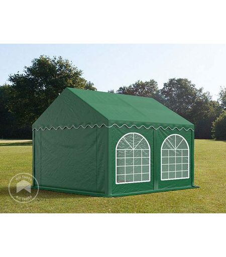 3x3m Marquee / Party tent w. ground frame, PVC 750, dark green: Are you looking for a party tent that is exceptionally tear-resistant, durable, and 100% waterproof? Look no further! Our advanced TOOLPORT [product_line] marquee in dark green with the dimensions 3x3m offers all this and more. Not only is it stable, but it is also corrosion-resistant, impact- and scratch-resistant, thanks to its bolted connection and fully galvanised steel poles (both inside and outside). The highly robust tarpaulin, made from PVC, features a dense grid inner mesh, ensuring it's easy to clean and weatherproof all year round. With UV protection of 50+, in line with EN 13758-1, it provides excellent protection against the elements. Additionally, you can benefit from modular side walls for added flexibility. The floor frame is included for enhanced stability. For added peace of mind, a flame-retardant version of the party tent is also available with certification. ...