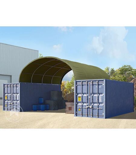 6x6m Container Top Shelter, PRIMEtex 2300, dark green: Discover the versatility of TOOLPORT container shelters in dark green with dimensions 6x6m, designed to provide a weatherproof and stable roof for your ISO containers. Whether for short, medium, or long-term use, your vehicles, materials, machinery, and bulk goods will remain safe and dry. Our models are equipped with fastening clips and offer a choice of tear-resistant PE tarpaulin 1400 or the highly tear-resistant PRIMEtex PVC tarpaulin 2300, which comes with a 5-year guarantee. The robust steel construction is backed by a 10-year guarantee. With a load-bearing capacity of up to 40 kg/m², this container canopy is quick and easy to install on a variety of surfaces. Plus, each product is supplied with both a static and fixing set for added safety. ...