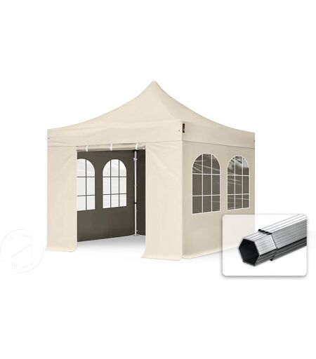 3x3m PES 800 Pop Up Gazebo PROFESSIONAL Aluminium 40 mm, incl. 4 side panels with Windows, cream: Looking for a versatile pop-up gazebo that suits both spontaneous events and long-term use? Look no further: the TOOLPORT [product_line] pop-up gazebo in cream with dimensions 3x3m is the perfect all-rounder. The corrosion-free aluminium frame, featuring hexagonal profile legs, offers excellent durability. Its high-quality finish, surface-sealed and brushed in accordance with DIN 17611 E2, ensures long-lasting performance, while the torsion-resistant wall thickness and 5-position height adjustment provide added flexibility. Weighing [product_weight], with a height of [product_height], length of [product_length], and width of [product_width], this modern pop-up gazebo is both lightweight and robust, making it ideal for frequent use. Additionally, our range includes flame-retardant certified models for added peace of mind. ...