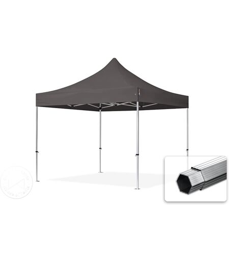 3x3m PES 800 Pop up gazebo PROFESSIONAL Aluminium 40 mm, dark grey: Looking for a versatile pop-up gazebo that suits both spontaneous events and long-term use? Look no further: the TOOLPORT [product_line] pop-up gazebo in dark grey with dimensions 3x3m is the perfect all-rounder. The corrosion-free aluminium frame, featuring hexagonal profile legs, offers excellent durability. Its high-quality finish, surface-sealed and brushed in accordance with DIN 17611 E2, ensures long-lasting performance, while the torsion-resistant wall thickness and 5-position height adjustment provide added flexibility. Weighing [product_weight], with a height of [product_height], length of [product_length], and width of [product_width], this modern pop-up gazebo is both lightweight and robust, making it ideal for frequent use. Additionally, our range includes flame-retardant certified models for added peace of mind. ...