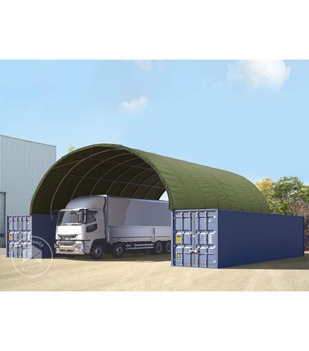 10x12m Container Top Shelter, PRIMEtex 2300, dark green: Discover the versatility of TOOLPORT container shelters in dark green with dimensions 10x12m, designed to provide a weatherproof and stable roof for your ISO containers. Whether for short, medium, or long-term use, your vehicles, materials, machinery, and bulk goods will remain safe and dry. Our models are equipped with fastening clips and offer a choice of tear-resistant PE tarpaulin 1400 or the highly tear-resistant PRIMEtex PVC tarpaulin 2300, which comes with a 5-year guarantee. The robust steel construction is backed by a 10-year guarantee. With a load-bearing capacity of up to 40 kg/m², this container canopy is quick and easy to install on a variety of surfaces. Plus, each product is supplied with both a static and fixing set for added safety. ...