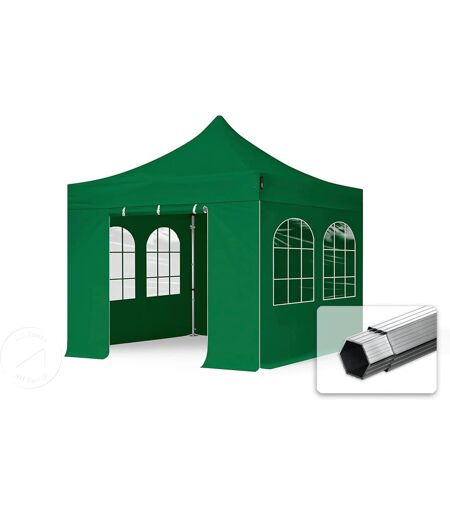 3x3m PES 800 Pop Up Gazebo PROFESSIONAL Aluminium 40 mm, incl. 4 side panels with Windows, dark green: Looking for a versatile pop-up gazebo that suits both spontaneous events and long-term use? Look no further: the TOOLPORT [product_line] pop-up gazebo in dark green with dimensions 3x3m is the perfect all-rounder. The corrosion-free aluminium frame, featuring hexagonal profile legs, offers excellent durability. Its high-quality finish, surface-sealed and brushed in accordance with DIN 17611 E2, ensures long-lasting performance, while the torsion-resistant wall thickness and 5-position height adjustment provide added flexibility. Weighing [product_weight], with a height of [product_height], length of [product_length], and width of [product_width], this modern pop-up gazebo is both lightweight and robust, making it ideal for frequent use. Additionally, our range includes flame-retardant certified models for added peace of mind. ...