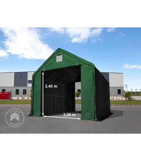 5x8m 3x3.4m Drive Through Industrial Tent, PRIMEtex 2300, dark green with statics package (soft ground anchors): Do you lack storage space or need a covered area for assembly work? The TOOLPORT [product_line] industrial tent in dark green, measuring 5x8m, is the ideal solution. With a height of [product_height] and a weight of [product_weight], this spacious and versatile structure provides durability and flexibility for a range of uses. The high-quality tarpaulin, made from PVC, is flame-retardant, highly durable, and designed to withstand wind and weather all year round. You can choose between a fully galvanised steel frame with a bolted construction—where all vertical bars are double-bolted with an inserted screw connection for low maintenance—or a truss construction featuring robust transverse steel bars along the side walls and a premium plug-in screw system. Both options come with a 10-year guarantee. For maximum accessibility, this industrial tent is equipped with pull-up doors on both gable ends. A safety static set is also included for added stability. ...