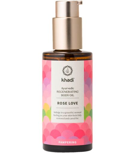 Nurture the queen in you with the khadi elixir in ROSE LOVE beauty oil! Enjoy how the graceful feeling of well-being spreads over your skin and gives you a feeling of perfection, security and joie de vivre. The authentic Ayurvedic formula of Rose Love body oil combines the pampering perfection of rose, turmeric and red sandalwood and brings them to their full potential. Your skin and your entire aura are particularly richly regenerated. Enjoy a sensually refreshed, smooth and refined complexion. The secret of the regenerating effect lies in the khadi Rose Love Elixir: according to traditional Ayurvedic recipes, hand-picked Indian medicinal herbs are gently boiled over an open fire in a traditional process. The Ayurvedic plant extract produced in this way (a medicinal decoction) combines the full potential and individual effectiveness of the individual plants to create a harmonious whole. - The rose stands for perfect beauty! It has been considered the queen of flowers for thousands of years. The essential oil from its blossoms contains more than a hundred active ingredients. Rose helps your skin to retain moisture, soothes it and strengthens the connective tissue. Rose stands for unconditional love for yourself and oneness with creation. - Turmeric has a gentle cleansing effect and has an antioxidant regenerating effect deep within the skin cells. Your skin begins to glow. - The joyful geranium renews the skin cells and soothes itching and eczema. It is similar to rose in scent and supports its gentleness with its lovely aura. Listen to your skin when it sings for you! Rose Love body oil is wonderfully nourishing as it rolls over your skin and envelops you in its rosy, luxurious fragrance. As you massage it in, you can feel how your skin is pampered and regenerated and your senses awaken. Discover the sonorous Rose Love application ritual here, which enhances the effect of Rose Love. Let us accompany you and surrender to the perfection of the rose. Together with the khadi Shatavari Everyoung Elixir Body Oil and the khadi Pink Lotus Beauty Elixir Body Oil, the khadi Rose Love Elixir Body Oil forms the "Holy Body" body oil series. Holy Body stands for holistic body and sensory care that helps you to bring out your inner radiance. khadi Skin & Soul Elixir body oils act on the skin like music on the soul. Love yourself and radiate from your heart inwards, into every cellThe queen of all body oils in its graceful perfectionThe Ayurvedic power of the khadi Rose Love Beauty Elixir regenerates, pampers & intensively nourishes even the most demanding skinThe rose in its aphrodisiac beauty provides the skin with silky-soft moisture, the miracle plant turmeric has a cleansing and gently regenerating effect deep into the skin cellsTraditional Ayurvedic recipe: 100% natural & vegan Application: khadi Rose Love Elixir Body Oil pampers your skin as soon as you apply it. The regenerating magic of the authentic Ayurvedic recipe unfolds. Feel the intensive... ...