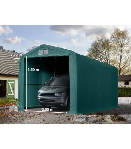4x8m 3.35m Sides Carport Tent / Portable Garage, 3.5x3.5m Drive Through, PRIMEtex 2300, dark green with statics package (soft ground anchors): Looking for a large, flexible garage or outdoor storage solution for industrial, commercial, or agricultural goods? Whether you're preparing for harsh weather or need reliable year-round protection, our TOOLPORT [product_line] Portable Garage in dark green, with dimensions 4x8m, offers exceptional durability. Featuring an extra-strong oval tube profile made from galvanised steel, this structure is both resilient and corrosion-resistant. The flat saddle roof design, with high sides, ensures ample clearance for easy access. You can choose between a PVC tarpaulin 850 with a strong grid inne rmesh or the premium PRIMEtex tarpaulin 2300, which is extremely robust, and designed to withstand tough conditions. The product weighs [product_weight], making it stable and reliable for your storage needs. ...
