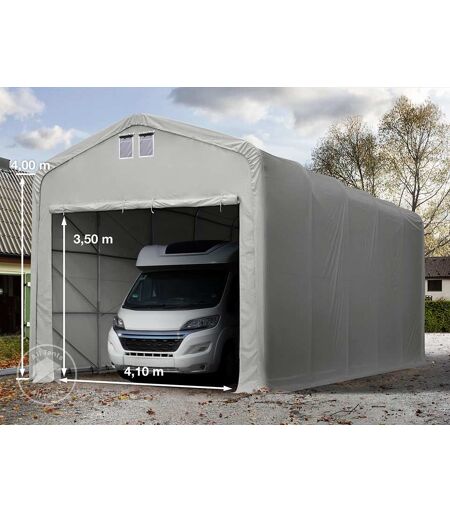 5x20m 4m Sides Carport Tent / Portable Garage, 4.1x3.5m Drive Through, PRIMEtex 2300, grey with statics package (soft ground anchors): Looking for a large, flexible garage or outdoor storage solution for industrial, commercial, or agricultural goods? Whether you're preparing for harsh weather or need reliable year-round protection, our TOOLPORT [product_line] Portable Garage in grey, with dimensions 5x20m, offers exceptional durability. Featuring an extra-strong oval tube profile made from galvanised steel, this structure is both resilient and corrosion-resistant. The flat saddle roof design, with high sides, ensures ample clearance for easy access. You can choose between a PVC tarpaulin 850 with a strong grid inne rmesh or the premium PRIMEtex tarpaulin 2300, which is extremely robust, and designed to withstand tough conditions. The product weighs [product_weight], making it stable and reliable for your storage needs. ...