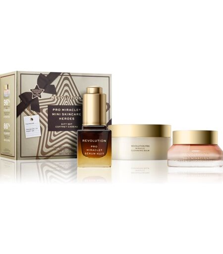 Revolution PRO Xmas 2025 Mini Skincare Heroes, 1 pc, Cleansing for Women, Everything for beautiful-looking skin in one package. The Revolution PRO Xmas 2025 Mini Skincare Heroes beauty gift set contains not one but several products to help you create or enrich your daily beauty routine and make you or your loved ones happy to get it as a gift. The set contains: Revolution PRO Miracle Night Rescue Moisturizing and Nourishing Serum for the face 10 ml Revolution Pro Miracle Cream Mini Moisturising Cream for the face 15 ml Revolution Pro Miracle Cleansing Balm Mini Makeup Removing Cleansing Balm for the face 30 g Characteristics: a treat for any woman amazing as a gift contains mini versions of products for perfectly soft and smooth skin products for deep nourishment and hydration to restore skin firmness everything for gentle and thorough makeup removal has a soothing effect Ingredients: vegan product hyaluronic acid – binds large quantities of water and hydrates intensively shea butter – nourishes, helps retain necessary hydration in skin, adds softness and smoothness, provides protection against drying and harmful external influences caffeine – helps fight dark circles, puffiness and bags under the eyes, provides antioxidant protection, promotes a clear and youthful appearance camomile extract – soothes, counteracts irritation, helps reduce redness and promotes regeneration ceramides – essential lipids naturally occurring in skin, are essential for the proper functioning of the protective skin barrier, hydrate and help prevent dryness, irritation, damage and wrinkles cocoa butter – rich in fatty acids, thanks to which it intensively nourishes, hydrates and promotes skin elasticity, creates a protective barrier preventing moisture loss, has smoothing effects niacinamide – promotes skin brightening, reduction of pigment spots, colour evenness and smoothing of rough texture, helps to strengthen the protective skin barrier and thus improve the level of skin hydration peptides – have hydrating, smoothing and softening effects, help reduce the visibility of wrinkles, promote skin firmness and elasticity, give a healthy, balanced and radiant appearance and strengthen the skin barrier squalane - locks water in skin by forming a protective layer on its surface, hydrates, softens and smooths, helps regulate sebum production, thanks to its strong antioxidant effects it also contributes to a balanced skin tone centella asiatica extract – restores and strengthens the skin barrier, supports the regeneration processes, soothes irritation, counteracts redness and dryness, has antioxidant effects, hydrates, helps fight skin ageing lavender oil - has a relaxing fragrance that promotes calming and relaxation of mind and body jojoba oil – keeps skin intensely hydrated, provides antioxidant protection, counteracts irritation and dryness, helps regulate sebum production and promotes regeneration How to use: Use every product from the cosmetic set according to... ...