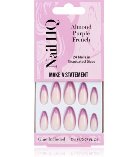 Nail HQ Almond Purple French, 24 pc, Manicure and Nail Files for Women, Expand your range of options to manicure your nails to perfection. This product from Nail HQAlmond Purple French will help you perfect your home manicure - it will enhance your routine and perfectly complement the tools or cosmetics you already use for it. It ensures that your nails are always perfectly shaped and well-groomed, making your hands look all the more beautiful. The set contains: Nail Glue 2 ml Characteristics: vegan product thanks to its excellent adhesion, it lasts on nails for a very long time allow you to create an unmissable salon-like manicure in minutes have perfectly smooth surface How to use: Press the artificial nail firmly onto your nail - first in the middle, then on the sides. Hold each nail down for at least 3 seconds. ...