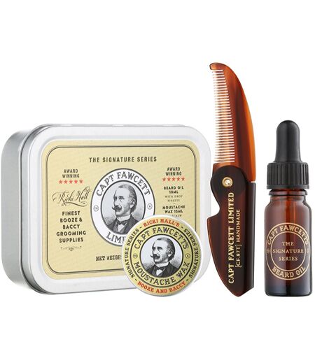 Captain Fawcett Ricki Hall´s Booze & Baccy Grooming Kit, 1 pc, Beard kits for Men, The Captain Fawcett Ricki Hall´s Booze & Baccy Grooming Kit cosmetic set contains everything you need for perfect beard care. The set contains: Beard Oil 10 ml Moustache Wax 15 ml Foldable Moustache Comb 1 pc Characteristics: detangles and smooths your beard/moustache adds a delicate fresh scent moisturises and does not dry out skin a complete routine for a perfect look How to use: Use every product from the cosmetic set according to the instructions. ...