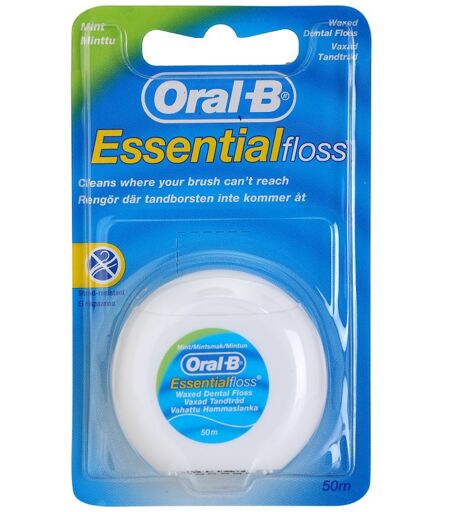 Oral-B Essential Floss, 50 m, Dental floss unisex, The Oral-B Essential Floss dental floss is an important accessory when it comes to interdental care. It helps in the fight against bacteria in places that a toothbrush does not reach. Characteristics: removes plaque from under the gum line slides easily between your teeth freshens breath has a waxed surface How to use: Use after regular cleaning of the teeth to clean the interdental spaces or after food to remove food stuck between the teeth. ...