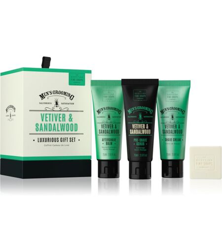 Scottish Fine Soaps Men’s Grooming Vetiver & Sandalwood, , Shaving kits for Men, Treat them to a cosmetic set Scottish Fine Soaps Men’s Grooming Vetiver & Sandalwood. It will make a shaving routine and aftercare a pleasant experience for any modern man. The set contains: Men's Grooming Vetiver & Sandalwood Pre-Shaving Skin Peeling 75 ml Men's Grooming Vetiver & Sandalwood Cleansing Bar 40 g After Shave Balm 75 ml Shaving Cream for men 150 ml Characteristics: set of products for everyday use products prevent skin irritation makes a great gift How to use: Use every product from the cosmetic set according to the instructions. ...