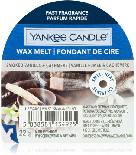 Yankee Candle Smoked Vanilla & Cashmere, 22 g, Wax Melts for Aroma Lamps Home Scents, The Yankee Candle Smoked Vanilla & Cashmere aroma lamp wax creates the ultimate fragrance effect in your home. The quick and easy way you can exchange it for a different wax means you can easily choose the exact scent for your mood. Characteristics: a spicy aroma a sweet aroma How to use: Never leave melted wax in the aroma lamp unattended or in the vicinity of easily flammable items. Do not leave the product within the reach of children or pets. ...