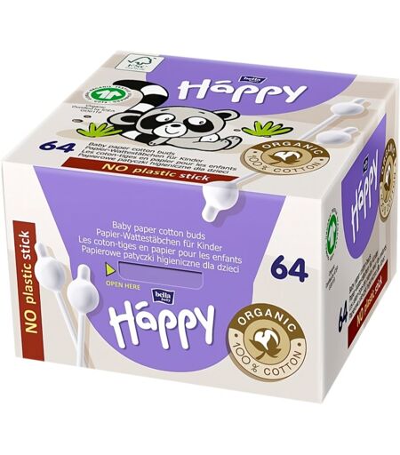Bella Baby Happy 100% organic cotton, 64 pc, Cotton buds For Kids, Characteristics: system to prevent the stick from entering the ear canal a practical re-closable box with a children’s design clean the ears gently and effectively for children’s delicate ears Ingredients: 100% cotton ...
