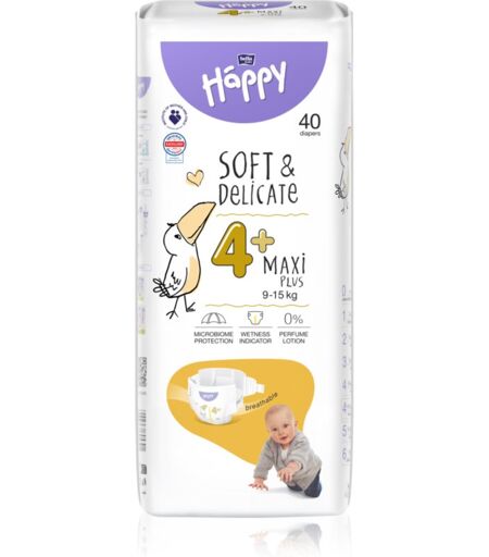 BELLA Baby Happy Soft&Delicate Size 4+ Maxi Plus, 40 pc, Disposable Nappies For Kids, A baby with a dry bum is a happy baby! BELLA Baby Happy Soft&Delicate Size 4+ Maxi Plus disposable nappies will keep your child comfortable all day and all night and keep their bottom nice and dry, so that you can enjoy every moment together without any worries. Characteristics: quick absorption for a dry feeling soft surface prevents leakage moisture indicator lets you know when you need to change the nappy elastic fastening strips dermatologically tested – suitable for newborns and sensitive skin extra breathable material free of allergens ...
