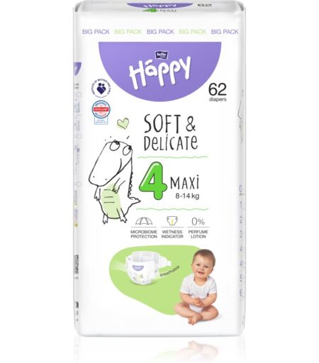 Bella Baby Happy Soft&Delicate Size 4 Maxi, 62 pc, Disposable Nappies For Kids, A baby with a dry bum is a happy baby! Bella Baby Happy Soft&Delicate Size 4 Maxi disposable nappies will keep your child comfortable all day and all night and keep their bottom nice and dry, so that you can enjoy every moment together without any worries. Characteristics: quick absorption for a dry feeling soft surface prevents leakage moisture indicator lets you know when you need to change the nappy elastic fastening strips extra breathable material dermatologically tested – suitable for newborns and sensitive skin free of allergens ...