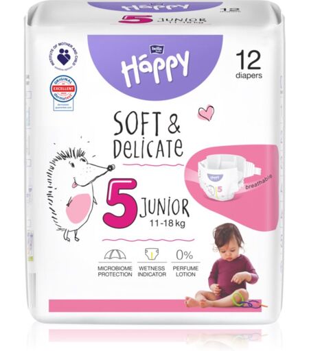 BELLA Baby Happy Soft&Delicate Size 5 Junior, 12 pc, Disposable Nappies For Kids, A baby with a dry bum is a happy baby! BELLA Baby Happy Soft&Delicate Size 5 Junior disposable nappies will keep your child comfortable all day and all night and keep their bottom nice and dry, so that you can enjoy every moment together without any worries. Characteristics: soft surface prevents leakage moisture indicator lets you know when you need to change the nappy elastic fastening strips extra breathable material dermatologically tested – suitable for newborns and sensitive skin free of allergens ...