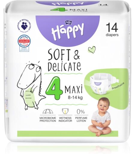 Bella Baby Happy Soft&Delicate Size 4 Maxi, 14 pc, Disposable Nappies For Kids, A baby with a dry bum is a happy baby! Bella Baby Happy Soft&Delicate Size 4 Maxi disposable nappies will keep your child comfortable all day and all night and keep their bottom nice and dry, so that you can enjoy every moment together without any worries. Characteristics: quick absorption for a dry feeling soft surface prevents leakage moisture indicator lets you know when you need to change the nappy elastic fastening strips extra breathable material dermatologically tested – suitable for newborns and sensitive skin free of allergens ...