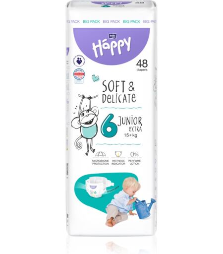 BELLA Baby Happy Soft&Delicate Size 6 Junior Extra, 48 pc, Disposable Nappies For Kids, A baby with a dry bum is a happy baby! BELLA Baby Happy Soft&Delicate Size 6 Junior Extra disposable nappies will keep your child comfortable all day and all night and keep their bottom nice and dry, so that you can enjoy every moment together without any worries. Characteristics: quick absorption for a dry feeling soft surface prevents leakage moisture indicator lets you know when you need to change the nappy elastic fastening strips extra breathable material dermatologically tested – suitable for newborns and sensitive skin free of allergens ...