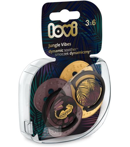 LOVI Jungle Vibes 3-6m, 2 pc, Dummies and pacifiers For Kids, Trust this tried-and-tested way to calm your baby down. The LOVI Jungle Vibes 3-6m dummy will make your baby feel safe within a few moments, and will soon become an essential and highly practical part of your everyday life with your new baby. Characteristics: ergonomic shape very good ventilation symmetrical shape soft teat orthodontic shape packed in a sterilising pouch prevents babies from developing a bite reflex doesn’t disrupt the sucking reflex promotes the correct growth of teeth and gums Ingredients: silicone How to use: Always use a dummy that corresponds to the baby’s current age. ...