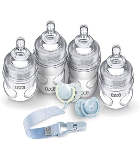 LOVI Newborn Starter Set Boy, , Baby Bottle Teats For Kids, Make life easier for yourself and your baby, or for a new parent you know. LOVI Newborn Starter Set Boy baby set is full of little essentials one needs in order to take care of a baby. This handy kit will always make for a wonderful gift. Characteristics: amazing as a gift suitable for babies including newborns soft teat doesn’t disrupt the sucking reflex protects the dummy from dirt and from getting lost promotes the right development of your baby’s oral cavity helps reduce the occurrence of colic dynamic teat promotes calm and relaxed drinking silicone teat timeless and elegant design The set contains: LOVI Medical+ baby bottle 2x150 ml LOVI Medical+ baby bottle 2x250 ml LOVI Baby Shower dummy ribbon 1 pc 0 m+ baby bottle teat 2 pc 3 m+ baby bottle teat 2 pc 0-2 m dummy 2 pc Ingredients: silicone products are dermatologically tested ...