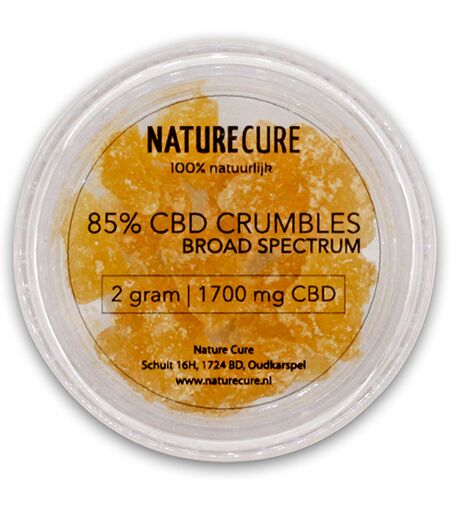CBD crumbles is broad spectrum CBD in a very pure form. In addition to CBD (Cannabidiol), these CBD crumbs also contain other cannabinoids such as CBG (Cannabigerol), CBDV (Cannabidivarin), CBN (Cannabinol) and less than 0,05 % THC (Tetrahydrocannabinol). In addition, CBD crumbles also contains naturally occurring terpenes for a maximum “entourage effect”. These crumbs are purified and free from leaf greens and therefore have a very soft taste. Nature Cure CBD crumbs can be consumed pure and after heating easily mixed with all possible oils. As a result, this product has many possible additions. The jar contains 2 grams of CBD crumbs, which gives a total of no less than 1700 mg of broad spectrum CBD. The features of this product are:- Unprecedented price / quality ratio- 2 grams of pure broad spectrum CBD- Rich in many cannabinoids and terpenes- After heating miscible with any oil- No less than 1700 mg of CBD Products have undergone extensive laboratory analysis to ensure the absence of synthetic cannabinoids. We prioritize quality and safety in products to provide you with the best experience possible. Please note: Not for children. Keep out of reach of children. Do not use when pregnant or breastfeeding. Always consult your doctor before before modifying or using any new product. This product is not intended to diagnose, treat or prevent any disease. Do not use immediately before and while driving a motor vehicle This product complies with all applicable laws and regulations. It is intended solely for industrial, technical, and horticultural purposes. Not intended for direct consumption or smoking. The product may naturally lose weight over time. Sale to individuals under 18 years of age is prohibited. Upon sale (in store / via shipping service / via other dispensing point), the seller will verify that the buyer is not under 18 years of age. ...