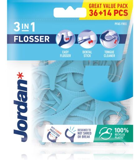Jordan Flosser 3in1, 50 pc, Dental floss unisex, The Jordan Flosser 3in1 dental floss is an important accessory when it comes to interdental care. It helps in the fight against bacteria in places that a toothbrush does not reach. Characteristics: removes plaque from under the gum line has pre-cut fibres guaranteed to be gentle on the gums removes food remnants slides easily between your teeth How to use: Use after regular cleaning of the teeth to clean the interdental spaces or after food to remove food stuck between the teeth. ...