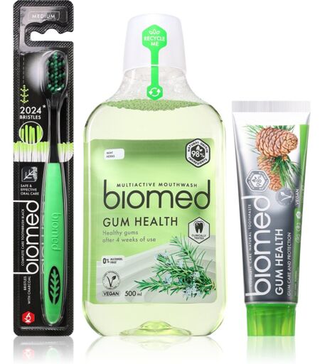 Biomed Gum Health Set, 1 pc, Natural oral care for Women, The set contains: Biomed Natural Whitening Mouthwash 500 ml Biomed Gum Health Organic Toothpaste 100 g Biomed Complex Toothbrush Toothbrush with activated charcoal 1 pc Characteristics: protects your teeth against periodontal disease soothes and strengthens the gums fights tooth decay protection against plaque kills bacteria cleans teeth reliably freshens breath How to use: Put toothpaste on the brush, moisten and clean the teeth and mouth. Rinse thoroughly. After cleaning the teeth, rinse the mouth with mouthwash for the time stated on the label then spit out. ...