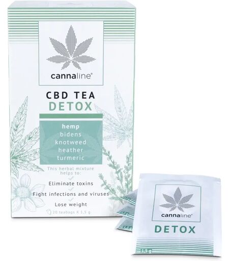 Eliminates toxins, fights infections and viruses and supports weight loss. Instructions: -Place a tea bag in your favourite cup (approx. 250 ml) - Pour boiling water (100 °C) onto the tea bag. - Steep for a good 15 minutes. Don’t rush it to get all the herbal benefits. - Remove the tea bag, relax and enjoy! Best time to drink CBD tea The cannaline CBD Tea DETOX can be enjoyed in the morning, during the day as well as before bed. Manufacturer: Cannaline Netto weight: 30 g Recommended dosage: 1-3 cups per day. Shelf life: 24 months Storage: Store in a dry place at a temperature up to 25˚C. Notice: Not intended for children. Keep out of reach of children. Do not exceed the recommended dosage. It is not intended as a substitute for a varied diet. Ingredients: Bidens 35 %, knotweed 16 %, rosehip 15 %, heather 15 %, hemp seed 10 %, mint 6 %, turmeric 2 %, hemp leaf 1 %. Vegan, No artificial color, No artificial flavour. Products with their designation comply with European law. All offered products contain less than 0,2 % THC and all seeds we use are certified and are on the list of approved varieties for cultivation, harvesting and processing in the EU. Please note: Not for children. Keep out of reach of children. Do not use when pregnant or breastfeeding. This product is a food supplement and is not intended to diagnose, treat, cure, or prevent any disease. Upon sale (at the store / via a transport service / via another dispensing point), the seller will verify that the buyer is not under 18 years of age. ...