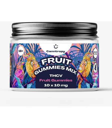 Canntropy THCV Fruit Gummies Mix, 10 pcs x 10 mg, 100 mg THCV, 25 g Discover Canntropy THCV Fruit Gummies Mix – the perfect blend of flavor and potency. These gummies with a mixed fruit flavor provide a unique experience thanks to their THCV content. Features: Fruit Gummies Flavour: Fruit Mix THCV content: 10 mg / 1 pc THCV content in total: 100 mg THC content: 0% Ingredients: Sugar, glucose syrup, gum base, dextrose, humectant, glycerol, sorbitol, lecithin, gum arabic, starch, vegetable oil, wax, colour, antioxidant, tetrahydrocannabivarin. Distributor: Brands of Hemp s.r.o.Žižkova 708, 261 01 PříbramCzech Republic Products have undergone extensive laboratory analysis to ensure the absence of synthetic cannabinoids. We prioritize quality and safety in products to provide you with the best experience possible. NOTE: DO NOT DRIVE OR OPERATE MACHINERY WHILE USING THIS PRODUCT. Do not use if you are pregnant, nursing, or have any diagnosed or undiagnosed medical conditions. Ensure that the purchase or use of this product complies with all applicable laws and regulations in your jurisdiction. Warning: Do not expose to direct sunlight. Store in a dry place. This product complies with all applicable laws and regulations. It is intended solely for industrial, technical, and horticultural purposes. Not intended for direct consumption or smoking. The product may naturally lose weight over time. Sale to individuals under 18 years of age is prohibited. Keep out of reach of children and pets. At the time of sale (in-store / via shipping service / through another dispensing point), the seller will verify that the buyer is not under 18 years of age. ...