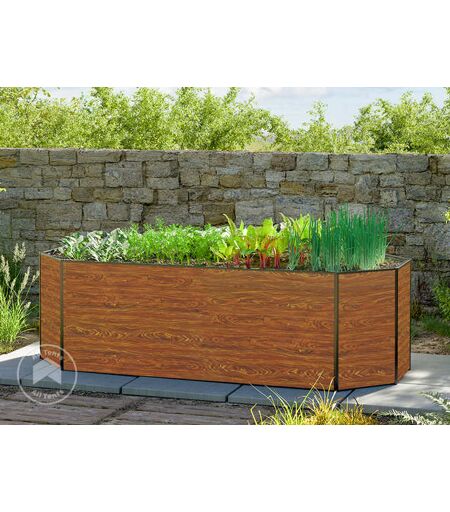 264 x 119 x 77 cm Raised garden bed, Wood-finish: Love growing your own vegetables but tired of bending down? The [product_line] raised garden bed from the trusted brand GFP in [colour], with dimensions 1,19x2,64m, offers the perfect solution. Designed for comfort and convenience, it allows you to tend to your plants without straining your back. Crafted from aluminium anodised planks (approx. 22 mm thick) and ‘Designed in Austria’, this durable and stable raised garden bed ensures long-lasting performance. The intuitive plug-in system makes assembly quick and straightforward. With a height of [product_height] and a weight of [product_weight], this modern, maintenance-free raised garden bed suits any garden style. Choose from a range of shapes to fit your space, including U-shaped, square, cross-shaped, octagonal, dumbbell-shaped, oval, or sloped at the front. A further advantage: no additional protective film is needed to guard against moisture. Plus, enjoy peace of mind with a 15-year guarantee on the aluminium frame. ...
