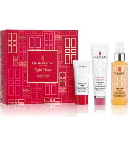 Elizabeth Arden Eight Hour, , Cosmetic Sets for Women, Everything for beautiful-looking skin in one package. The Elizabeth Arden Eight Hour beauty gift set contains not one but several products to help you create or enrich your daily beauty routine and make you or your loved ones happy to get it as a gift. The set contains: Elizabeth Arden Eight Hour Moisturizing Oil for face, body and hair 100 ml Protective Cream for Face and Body 50 ml Moisturising Hand Cream 30 ml Characteristics: amazing as a gift a treat for any woman for intense skin hydration for skin brightening and revitalisation ...
