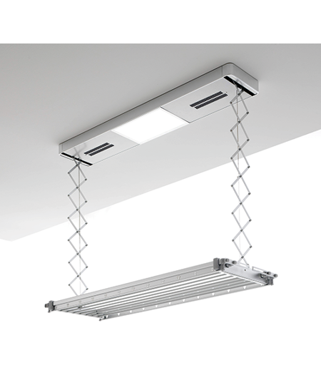 Space-saving ceiling-mounted clothes drying rack with remote control. Foxydry Pro is also equipped with 2 ventilation fans that emit room temperature air and warm air: the heating system will speed up the drying even in the coldest days. You can slide this ceiling-mounted drying rack all the way down its 180cm maximum height or stop it at any intermediate position. It holds up to 35kg of wet washing. Total drying length: 16m. Equipped with a LED light, fans and 2 rails that can be extended up to a length of 200cm to hang up large and bulky items of laundry (bed sheets, duvet covers, etc.) without interruptions. 18 positions to hang your items on clothes hangers. Entirely made of steel and anodized aluminium for long-term durability. It can be fixed to the ceiling by means of 4 plugs. Covered by a 2-year warranty. Wall-mounted with Foxydry brackets. ...