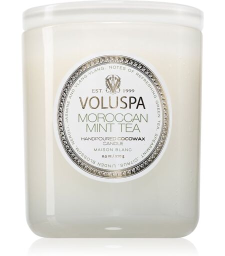 VOLUSPA Maison Blanc Moroccan Mint Tea, 270 g, Scented Candles Home Scents, The VOLUSPA Maison Blanc Moroccan Mint Tea scented candle will give your home a wonderful fragrance and create a cosy atmosphere that will make you feel great all the time. Characteristics: citrus fragrance vegan product designer packaging long burning time a luxurious accessory for any room clean burning Ingredients: cotton wick with coconut wax How to use: Place the candle on a heat-resistant surface. Do not leave to burn for more than four hours. Never let the candle burn to the end. Never leave a burning candle unattended or close to easily flammable objects. Keep out of the reach of children and pets. Always let the candle burn until the surface completely melts to prevent an unwanted hollow in the wax from forming. ...