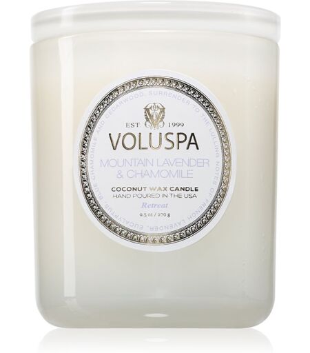 VOLUSPA Maison Blanc Mountain Lavender & Chamomile, 270 g, Scented Candles Home Scents, The VOLUSPA Maison Blanc Mountain Lavender & Chamomile scented candle will give your home a wonderful fragrance and create a cosy atmosphere that will make you feel great all the time. Characteristics: a floral fragrance a summer fragrance vegan product designer packaging long burning time a luxurious accessory for any room clean burning Ingredients: with coconut wax cotton wick How to use: Place the candle on a heat-resistant surface. Do not leave to burn for more than four hours. Never let the candle burn to the end. Never leave a burning candle unattended or close to easily flammable objects. Keep out of the reach of children and pets. Always let the candle burn until the surface completely melts to prevent an unwanted hollow in the wax from forming. ...