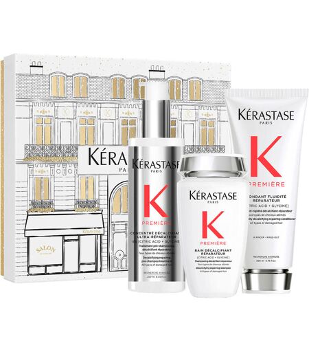 Première Light XMas Set - The Concentré Décalcifiant strengthens the hair, making it stronger and shinier. The Bain Décalcifiant Réparateur hair bath repairs severely damaged hair and the conditioner makes hair supple. This set contains: Concentré Décalcifiant Ultra-Réparateur 250 mlBain Décalcifiant Réparateur 250 mlFondant FLuidité Réparateur 200 ml Application: Apply the pre-shampoo to wet lengths before shampooing, massage in and leave on for 5 minutes. Do not rinse out. Then wash the hair with Première Bain Décalcifiant. Massage in conditioner, leave on for 2 to 3 minutes and rinse. In case of contact with eyes, rinse thoroughly immediately. ...